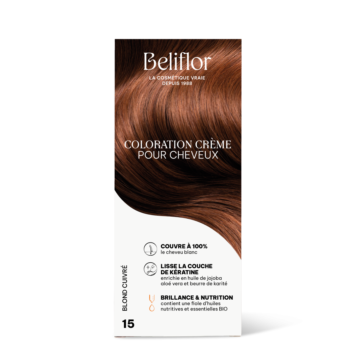 De ce fait, la coloration crème de Beliflor est enrichie d'extraits végétaux pour relisser la couche de kératine : l'huile de jojoba, le gel d'aloe vera et le beurre de karité.